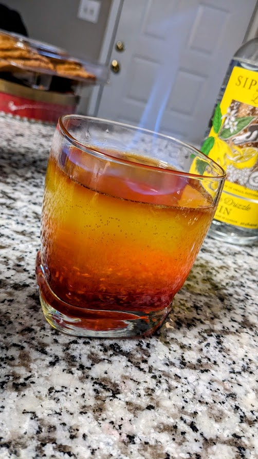 The Flame can be enjoyed in a variety of ways, whether you choose to light it on fire or not. The top yellow layer is similar to a gin fizz while the bottom layer offers a more thick and fruity finish. Personally I like to add a few ice cubes and mix everything together after blowing out the fire, but the cocktail can be sipped without mixing as well.